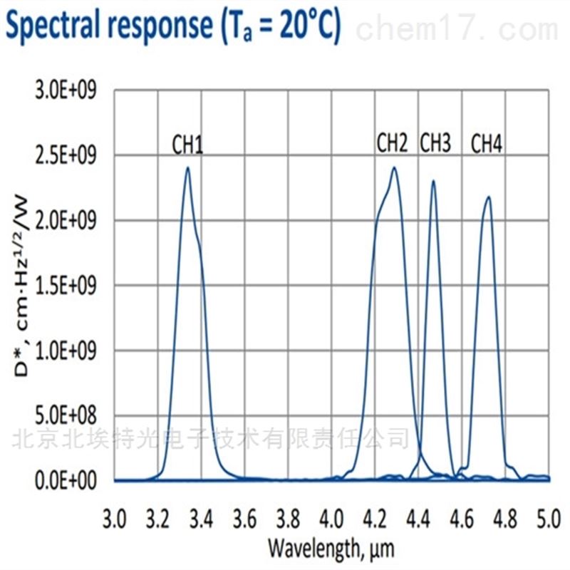 | 中心波长: | 3330、3897、4260、4712 纳米 | 探测率D*: | >3.37E10 cmHz1/2/W |